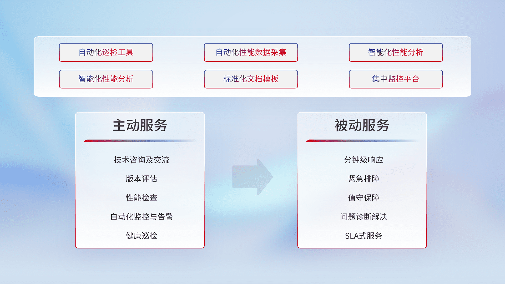 智能化工具和标准化文档,,保障服务质量,,,提供主动服务(包含技术咨询、、、、版本评估、、、、性能检查、、、、自动化监控与告警、、、、健康巡检)和被动服务包含(分钟级响应、、、、紧急排障、、、值守保障、、、、问题诊断解决、、、、SLA服务)。。。